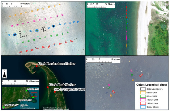 This study focuses on the data collected during three trials from the larger study (MR19-5079)—trials 4, 5, and 6. All three trial sites for this study are on Cape Cod, MA, USA (Figure 3). Trials 4 and 5 take place in Wellfleet, MA, USA and trial 6 in Provincetown, MA, USA. Cape Cod Bay is ideal for these types of investigations due to the variability of intertidal bottom types (mud, sand, and gravel), as well as the mesotidal range (3.07 m) and semidiurnal tidal cycles that occur (NOAA, 2022). The tidal range and cycle allow for the intertidal deployment and surveying during an early morning low tide, a mid-day, high-tide vessel-based survey, and an end-of-day, low tide, re-survey and retrieval of objects within a single day.