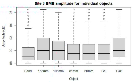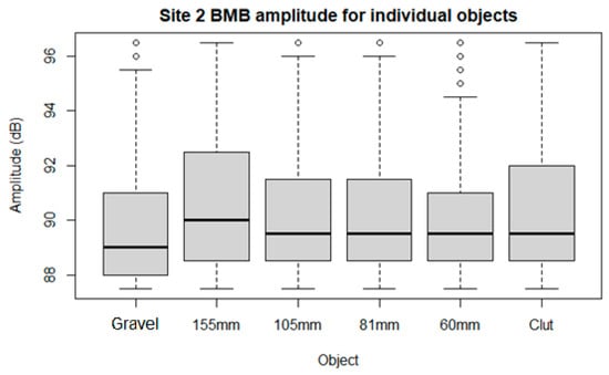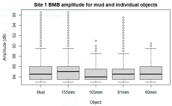 The full data set from each site contained 3.0 × 106, 10.9 × 106, and 7.5 × 106 soundings for sites 1, 2, and 3, respectively. The third quartile BMB amplitude value for each of the surveys was 83 dB, 87.5 dB, and 88 dB, for sites 1, 2, and 3, respectively. The filtered data sets contained 7.5 × 105, 3.0 × 106, and 2.1 × 106 soundings for sites 1, 2, and 3, respectively. These data sets differ in size due to the different number of targets mapped and site accessibility with regards to possible variability of survey line orientation. The filtered amplitude ranges for each object across sites 1, 2, and 3 are represented in Figure 5, Figure 6 and Figure 7, respectively. For the box plots below, the solid black line represents the median value, with the lower and upper bounds of the gray box representing the first and third quartile value, respectively. The extension lines, or whiskers, from the box show the maximum and minimum of the data within 1.5 times the interquartile range. The small dots outside of this range represent outliers that are outside of this interquartile range.