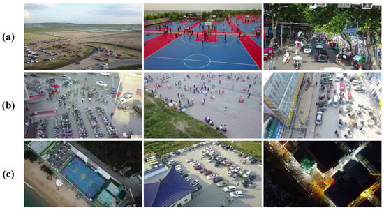 Intuitive cases to explain the three main problems in object detection in drone-captured images. The cases in row (a), (b), and (c), respectively, show the size variation, high-density, and large coverage of objects in drone-captured images.