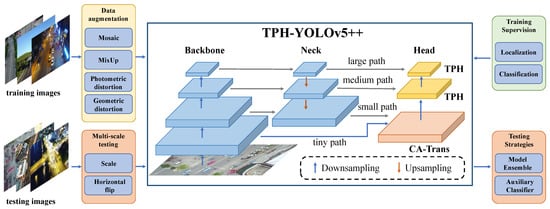 The overall architecture of TPH-YOLOv5++. Different from the TPH-YOLOv5, TPH-YOLOv5++ removes the additional head and introduces the CA-Trans to enrich the features of small paths. The CA-Trans takes and as inputs and outputs . After a Conv. layer, a new is predicted to absorb the best of the original and .