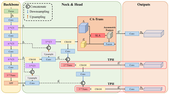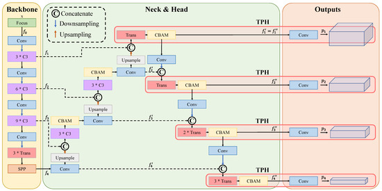 where and are concatenate and upsampling operations, respectively; denotes the combination of different modules; in and , the consists of three CSPbottleneck modules, a CBAM module, and a Conv layer; and the in is composed of a transformer module and a CBAM module.