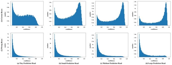 The distributions of confidence of each prediction bounding box generated by four prediction heads. The bounding boxes are split into correct boxes and wrong boxes. The first and second row are the distributions of correct and wrong boxes, respectively.