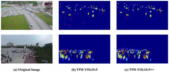 We visualize the spatial distribution of correct bounding boxes generated by the small prediction heads of TPH-YOLOv5 and TPH-YOLOv5++, as shown in Figure 11. Similar to Figure 5, the color of each pixel denotes the average confidence of correct boxes covering the pixel. If the confidence is high, the color tends towards red, otherwise it tends towards blue.