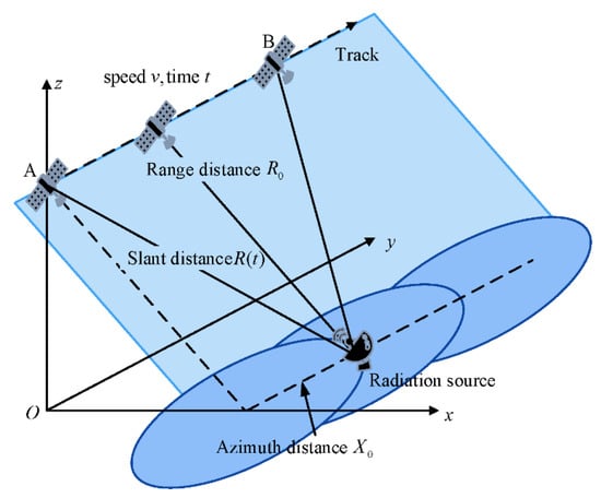 The y-axis is parallel to the flight track of the receiver, the z-axis is the direction from the center of the earth to the receiver, and the x-axis direction is determined by the right-hand rule. The receiver flies over the source radiation at speed and the flight time of the satellite is . and denote the range and azimuth distance of the radiation source, respectively. The range direction is perpendicular to the flight track and the azimuth direction is parallel to the flight track. The receiver can receive a signal from the radiation source for the first time at starting point A and can just miss the signal at point B. Thus, the slant distance from the satellite to the radiation source is