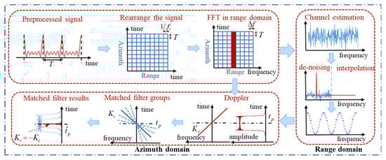 In conclusion, the principle of the algorithm is shown in Figure 4. First, the received baseband signal is preprocessed to remove the CP and the preprocessed signal is rearranged into range and azimuth domain. Then FFT is performed along the range domain to extract the signal at a particular frequency. Next, to compensate for the phase of the data symbol, we use the least square method and transform domain interpolation method to estimate the channel based on the known DM-RS and use the channel characteristics for denoising. Then we extract the compensated signal at a particular frequency in the range domain, obtaining an LFM signal in the azimuth domain with a particular centroid frequency and chirp rate which contain the location information. Finally, we construct a series of matched filters at different distances and perform pulse compression. By reorganizing the results by distance, the range and azimuth location can be obtained by focusing and searching.