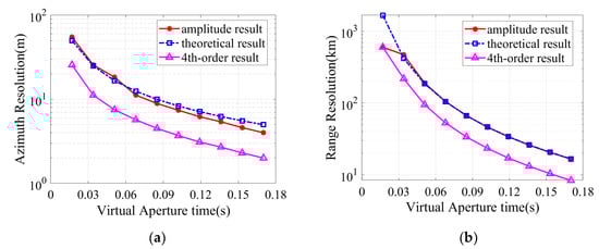 After Monte Carlo simulations, the azimuth and range resolution curves of the amplitude spectrum and 4th-order spectrum are shown in Figure 7. The result shows that the azimuth and range resolution will be better with the longer virtual aperture. In addition, the simulation result is basically consistent with the theoretical result as Equations (22) and (24).