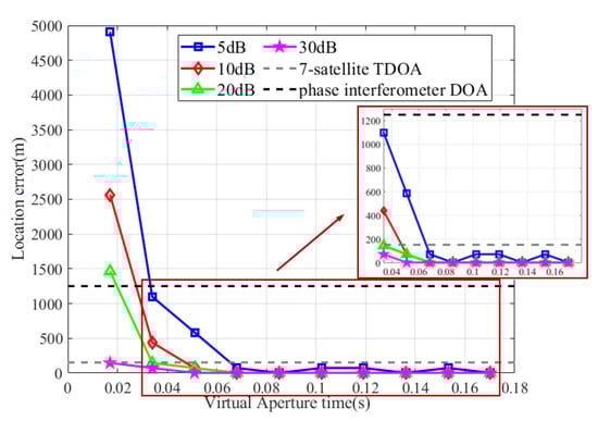 Monte Carlo simulations (100 times) under different SNR are carried out, and the location error curve variation with the virtual aperture is shown in Figure 8, which was compared with the traditional DOA and TDOA methods. The DOA method is using phase interferometer for direction finding, the baseline is 5 m, and the phase ambiguity is solved by a shorter baseline with a length of 0.5 m. TDOA method uses Chan to solve the radiation source location with seven satellites. Both methods are simulated at 20 dB SNR. Compared with the DOA method, the accuracy of the virtual aperture passive location method is significantly improved, and Figure 8 shows that the longer virtual aperture leads to higher location accuracy. When SNR = 5 dB and virtual aperture time , the location error is approximately the same as the DOA method. Under the condition of higher SNR and longer virtual aperture, the location accuracy can reach tens of meters, which is similar to that of the TDOA method, but the system complexity and cost are greatly reduced because only a single satellite and antenna are used. The configuration of satellites is shown in Figure 9. The distance between the satellites is about 100 km.