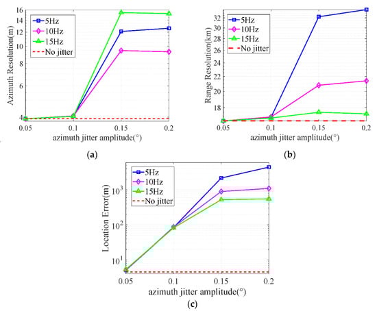 The Monte Carlo simulations of the satellite vibration effect are shown in Figure 10. Since the virtual aperture time is , we consider the two cases that the azimuth jitter frequency (5 Hz) and (10 Hz, 15 Hz). The range jitter amplitude is 0.05°, and the frequency is 2 kHz; the azimuth jitter amplitude and frequency are set as shown in Figure 9, and the initial phase is random.