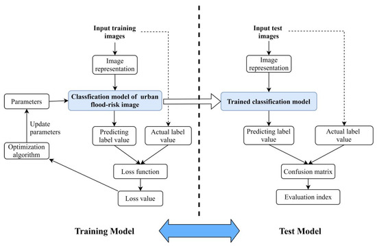 As a waterlogging incident has an unstable shape, we considered using deep-learning-based computer vision algorithms to identify urban waterlogging statuses. The steps of the image classification method based on deep learning include data set construction, classifier design and learning, and classifier decision. The classifier design and decision-making processes are illustrated in Figure 1.