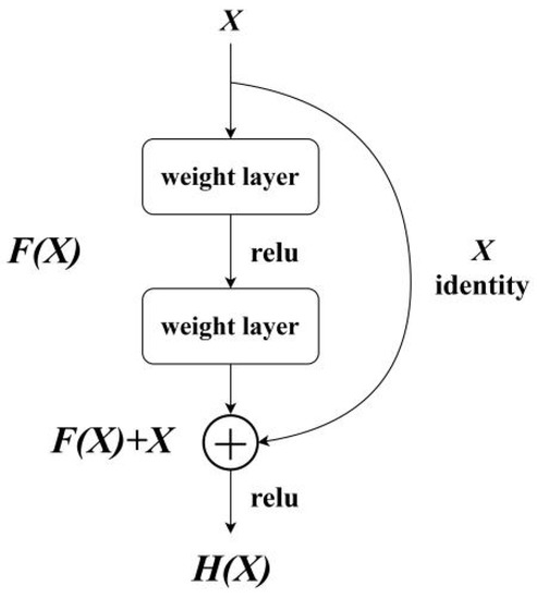Typically, as a network layer increases, the gradient of the network disappears or decreases, increasing the error rate. This phenomenon is called network degradation. ResNet was first proposed by He [36] and addresses the network degradation problem by introducing a deep residual learning framework with shortcut connections (Figure 2). The algorithm has proven to be highly effective for image classification and image segmentation tasks [37].