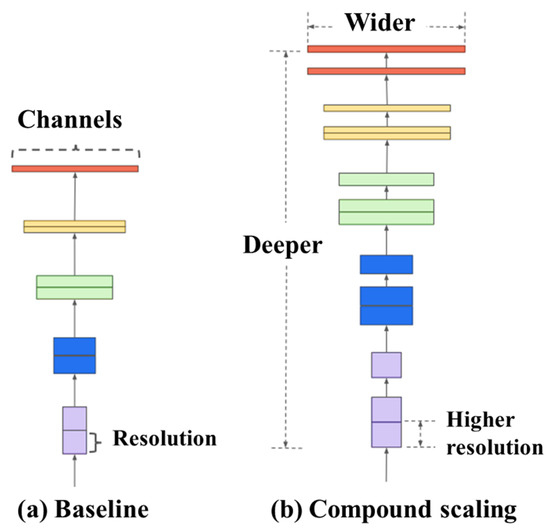 The core of EfficientNet is to construct a standardized convolutional network expansion method [38] that can achieve high accuracy and save computational resources, that is, to optimize the efficiency and accuracy of the network by balancing the three dimensions of resolution, depth, and width (Figure 4). As seen in Figure 4a is EfficientNet’s baseline and (b) is the main idea of EfficientNet, which is to comprehensively expand the width, depth, and resolution of a network.