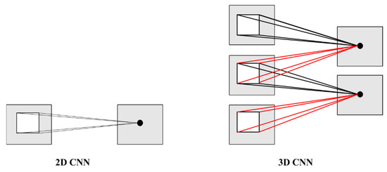 A 3D CNN is used for human action recognition [39] based on video classification. Image classification based on a 2D CNN only considers the feature of a single image, while a 3D CNN considers the dynamic relationship between consecutive images to capture the motion information between frames (Figure 5). The value at position (x, y, and z) on jth feature map in the ith layer is given by: