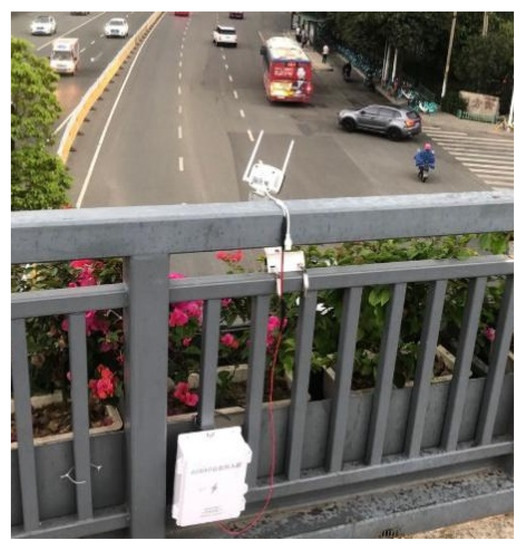 Fuzhou, the capital of Fujian Province, is located on the southeastern coast of China (26°08′N, 119°28′E). In the experiment, a camera was installed at an overpass above (Figure 10) the road and aimed at the overflowing municipal pipe network inspection well to obtain a video stream. The picture resolution was 2560 × 1440, with 96 dots per inch, and the frame rate of the camera was 25 frames per second.