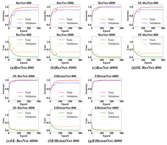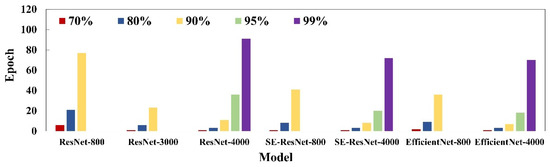 When the number of training datasets was 800, the recognition accuracy of both the ResNet and SE-ResNet models on the validation datasets reached 93%, and no significant difference existed between the models in the index of the highest accuracy. Meanwhile, Figure 13 shows that the numbers of epochs were 6, 22, and 71 when ResNet reached 70%, 80%, and 90% accuracy, respectively, and the numbers of epochs were 1, 9, and 41 when SE-ResNet reached corresponding accuracies, respectively. Thus, compared with ResNet, SE-ResNet achieved higher accuracy with fewer training epochs. Similar to SE-Resnet, EfficientNet achieved higher accuracy faster than ResNet on fewer data sets, but the highest accuracy was still limited by the amount of data. With 800 training datasets, EfficientNet achieved 80% and 90% levels of accuracy at the 9th and 36th epochs, respectively, which was close to half of the number of training rounds required by ResNet, but the best accuracy was not significantly improved. With 4000 training datasets, EfficientNet could also achieve more than 99.5% accuracy, which was close to the accuracy achieved by SE-ResNet (Table 2).