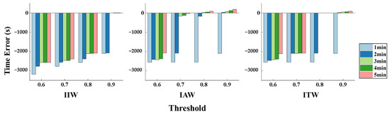 However, when the error was less than 5 min, the result of the IAW (Figure 16 and Figure 17) tended to be more delayed than that of the ITW. For example, when the threshold was set to 0.8 and the backtracking time was set to 3 min, the error of the IAW was 25 s, while that of the ITW was -5 s. It is worth noting that when the threshold was 0.9 and the backtracking time was 2 min, the time errors of both methods were less than 30 s (25 s and 15 s, respectively).