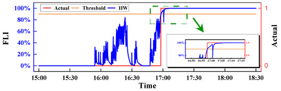 For example, as shown in Figure 16, when the IIW was used as the evaluation basis for waterlogging recognition, the curve oscillated sharply during the waterlogging process. This phenomenon occurred because the evaluation weight of the IIW on the image recognition results near each moment was relatively large, and the sensitivity to the recognition results of the waterlogging scenes was relatively strong. The evaluation weight of the single preceding moment accounted for 21.36% of the total evaluation weight, whereas the evaluation weight of the previous 12 moments (1 min) accounted for 52.35%. Hence, after rainfall, the index frequently appeared in 60% to 80% of the results and quickly decreased to below 50%. In addition, at 17:02, the index decreased once to 80%, which was lower than the threshold, and the scene was mistakenly determined as a non-flooding scene. Therefore, the use of the IIW for waterlogging recognition has the shortcomings of instability and low accuracy. However, the IIW method responds faster to flooding scenarios, with nearly no time error.
