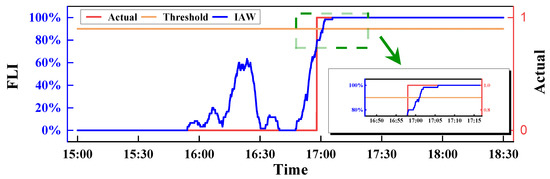 When the IAW was used as the evaluation basis for waterlogging identification, as shown in Figure 15, the curve exhibited a gentle trend during the waterlogging process. The IAW evenly assigned weights to all images within the first 5 min; hence, the images within the discriminant range showed no significant differences in the impacts of the recognition results. Before the occurrence of waterlogging, although some images were positive, the was always lower than 75%, and after the occurrence of waterlogging, some images were negative but no obvious decrease or shock occurred. However, the IAW method showed a higher delay in recognizing the occurrence of waterlogging, and the time error of the recognition was 190 s later than the actual time.