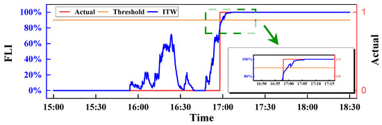 As the evaluation basis for waterlogging identification, the ITW simultaneously considered the stability and timeliness of the judgment. As shown in Figure 18, the curve with the ITW was relatively flat. The ITW divided the images into five levels at intervals of 1 min and assigned weights that were positively correlated with the time interval. Before the occurrence of waterlogging, the was lower than 80%, and after the occurrence of waterlogging, although some images were judged as negative, the only fluctuated slightly and did not fall below the threshold. Moreover, the delay in the ITW method in recognizing the occurrence of waterlogging scenes was within an acceptable range, and the time error was only 90 s later than the actual waterlogging occurrence time.