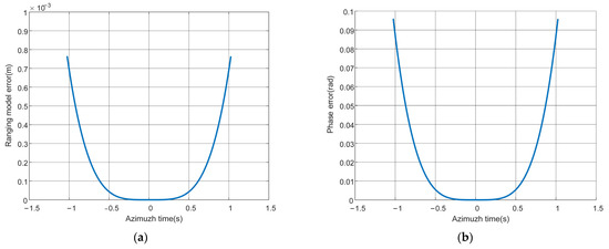 Figure 2 shows the ranging model error and its phase error represented by the Equation (4) under the parameters in Table 1. Obviously, in the whole synthetic aperture time, the phase error is less than the tolerance limit of phase coherence, which is [1]. Using the principle of stationary phase (POSP) [51] and MSR [29], the two-dimensional spectrum of the received signal can be derived and then expanded it to the cubic term of , which is given by