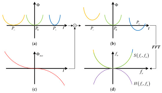 Diagrams for the processing of NLCS. (a) The quadratic phase of targets , , in the time domain; (b) Quadratic phase of targets , , after introducing the NLCS factor in the time domain. (c) NLCS factor; and (d) Uniform phase filtering in the frequency domain.