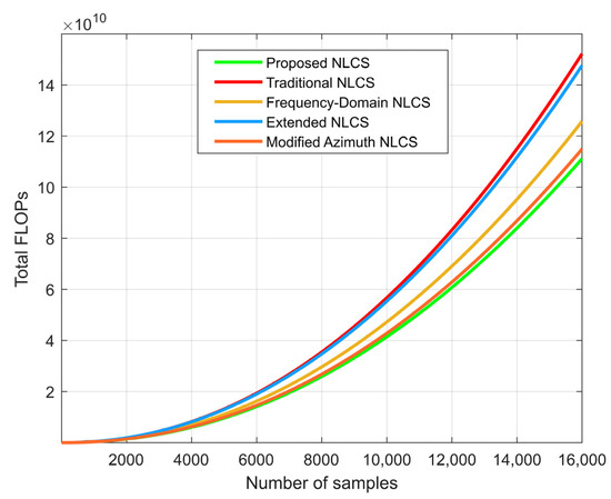 The total FLOPs of the proposed NLCS, traditional NLCS [40], frequency-domain NLCS [22], extended NLCS [43] and the modified azimuth NLCS algorithms [53].