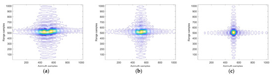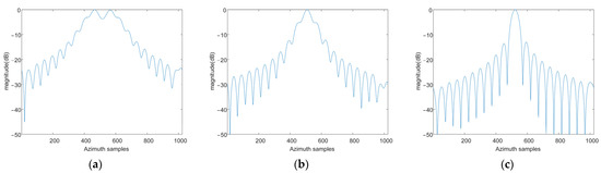 Azimuth profiles of target P5 processed by different algorithms. (a) The conventional method; (b) The reference method; and (c) The proposed method.