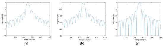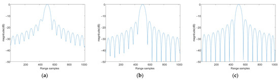 Range profiles of target P1 processed by different algorithms. (a) The conventional method; (b) The reference method; and (c) The proposed method.