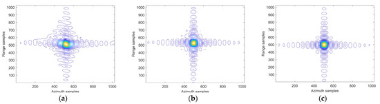 Contour plot of target P5 processed by different algorithms. (a) The conventional method; (b) The reference method; and (c) The proposed method.