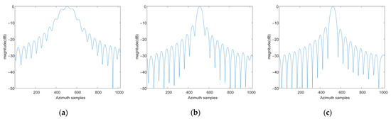 Azimuth profiles of target P1 processed by different algorithms. (a) The conventional method; (b) The reference method; and (c) The proposed method.