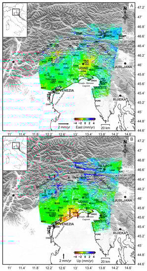 Regarding the Venetian-Friulian plain and coastal areas, active subsidence has been described in response to natural (sediment compaction) and anthropogenic causes (e.g., urbanization or groundwater and gas pumping) [18,52].