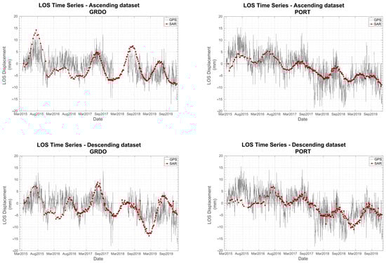 After the processing procedures explained in the previous section, the preliminary results consist of two calibrated LOS mean ground velocity maps, as shown in Figure 4C,D. During the linear estimation of the velocity for each PS, we also compute the standard deviation, which is characterized by mean values of 0.2 mm/yr for both LOS datasets, indicating low spatial variability of the InSAR displacement measurements w.r.t. a linear model (Table S4; Figure S3).
