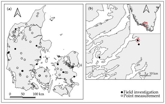 Sampling sites of the (a) Danish (DK) and (b) southwest Greenlandic (GR) soils. Red squared area shows the location of four GR fields. Red circle denotes the location of two adjacent fields represented by one location.