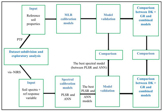 A graphical representation of the methodology for predicting the Kd of glyphosate. vis–NIRS, visible near-infrared diffuse reflectance spectroscopy; PTF, pedotransfer function; MLR, multiple linear regression; PLSR, partial least squares regression; ANN, artificial neural network; DK, Denmark; GR, Greenland.