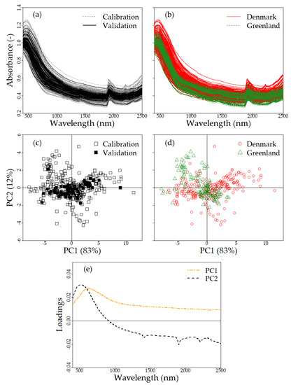 Spectral response for (a) the calibration and validation subsets of the combined dataset and (b) the Danish and Greenlandic datasets; score plots for (c) the calibration and validation subsets of the combined dataset and (d) the Danish and Greenlandic datasets; and (e) loadings plot for all soil samples.