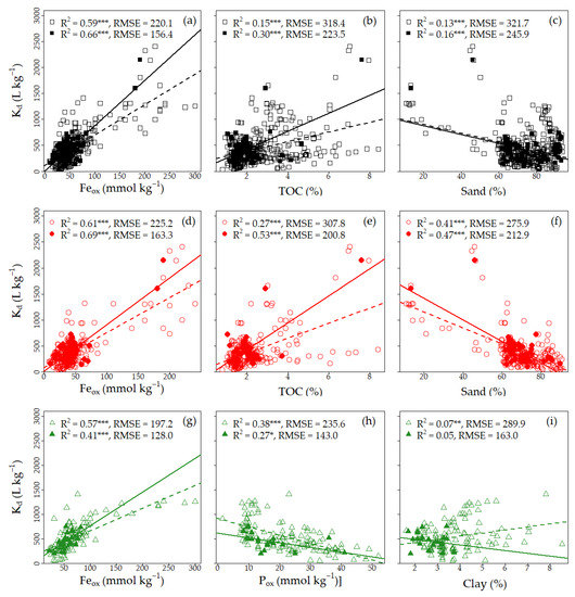 | Combined calibration subset | Kd a = 1524.34 − (5.87 × sand) + (55.62 × TOC b) − (131.54 × pH) + (4.56 × Feox c) − (13.39 × Pox c) |