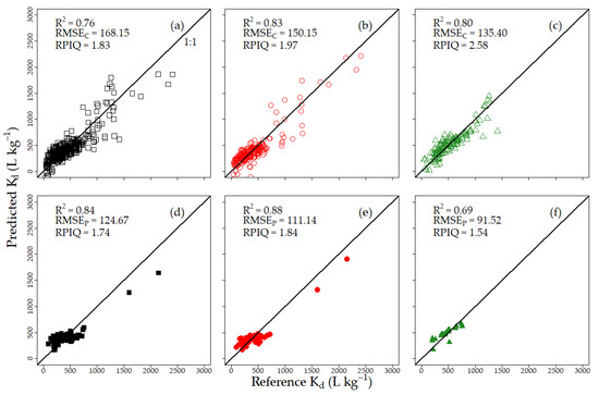 The PTF generated from the calibration subset of each dataset was used for validation (Figure 5). The DK and GR calibration PTFs performed better than the combined calibration PTF (RPIQ = 1.97, 2.58, and 1.83, respectively). However, GR validation PTFs had the lowest RPIQ among all validation PTFs. Two samples with the highest Kd values influenced the combined and DK validation PTFs’ performance (Figure 5d,e). The R2 and RMSEP values decreased, and RPIQ increased when those two extreme samples were removed from the two above-mentioned PTFs. As an example, R2, RMSEP, and RPIQ shifted from 0.84 to 0.45, 124.67 to 107.64 L kg−1, and 1.74 to 2.02, respectively, when those two extreme samples were removed from the combined validation PTF.