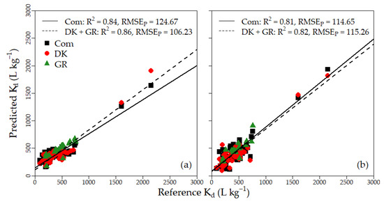 Comparison of the prediction accuracy of the Kd of glyphosate between the combined validation subset and the joint individual validation subsets. Comparison was performed for the (a) PTFs and (b) vis–NIRS models. Com, results from the combined validation model; DK, results from the Danish validation model; GR, results from the Greenlandic validation model.