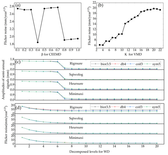 We selected the vertical time series at an IGS station, BJSH, with a lower flicker noise (18.85 mm/year0.25) as the test sample to find the optimal settings for the denoising methods for the CEEMD, VMD, and WD. In addition, the components, decomposed by CEEMD and VMD, require a criterion to define the noise and signal components as mentioned above. We also introduce the Hausdorff distance as the filtering criterion (see Appendix B), which was proved to be an efficient and robust criterion [40].
