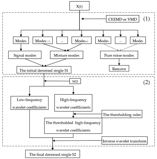 Wavelet denoising (WD) is an essential application of wavelet analysis, in which the wavelet coefficients are handled by a threshold rule in the decomposition and reconstruction of the signal through the wavelet transform. The procedure of WD can be accomplished in three stages [16,37,38]: firstly, the noisy signal is decomposed by applying the wavelet transform with orthogonal scaling functions and wavelet functions to obtain a sequence of wavelet coefficients comprising high-frequency and low-frequency components. Then, a thresholding rule is used for high-frequency coefficients. Finally, the denoised signal is derived by reconstructing the coefficients using the inverse wavelet transform operation.