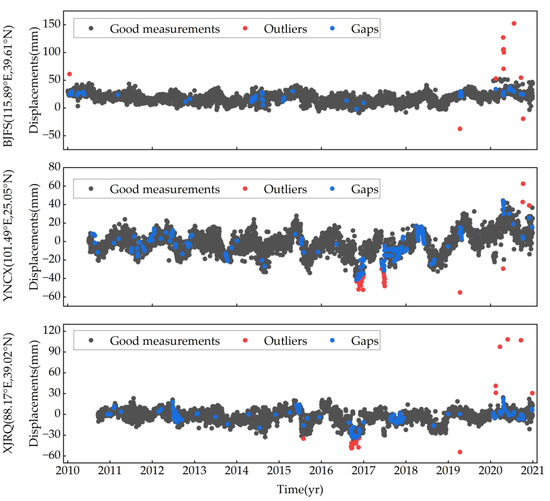 The vertical time series before and after conducting the pre-processing procedure of three typical GPS sites (BJFS: 115.89°E, 39.61°N, YNCX: 101.49°E, 25.05°N and XJRQ: 88.17°E, 39.02°N) are shown. Good measurements (black points) plus outliers (red points) present the raw time series. Good measurements (black points) plus gaps (blue points) present the input time series to our investigations.