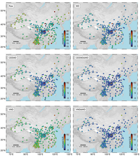 Figure 5 exhibits that the distribution of flicker noise for the four strategies is similar to Raw, but with significantly lower amplitude after subtracting the bouncing noise from the GPS coordinate time series. The averages of flicker noise for 226 GPS stations are 3.92 mm/year0.25 for CEEMD, 2.78 mm/year0.25 for CEEMD & WD, 6.1 mm/year0.25 for VMD, 2.82 mm/year0.25 for VMD & WD, and 3.84 mm/year0.25 for WD, respectively, all of which are notably lower than the Raw. For CEEMD, 104 stations have flicker noise of less than 3 mm/year0.25, 76 stations have flicker noise between 3 and 5 mm/year0.25, and 45 stations have flicker noise more remarkable than 5 mm/year0.25 at a level of 5–8 mm/year0.25. All stations for VMD have a flicker noise level of 3–12 mm/year0.25. There are 48 stations with amplitudes between 3 and 5 mm/year0.25, and 163 GPS stations have results between 5 mm/year0.25 and 9 mm/year0.25, accounting for about 72.12% of the stations. For both hybrid methodologies, amplitudes of flicker noise are limited to 10 mm/year0.25, and 211 stations, representing almost 93.36% of total sites, do not exceed 5 mm/year0.25. In detail, 138 stations show a flicker noise between 3 and 4 mm/year0.25 after denoising with CEEMD & WD, while 144 stations show a noise in this range after denoising with VMD & WD.