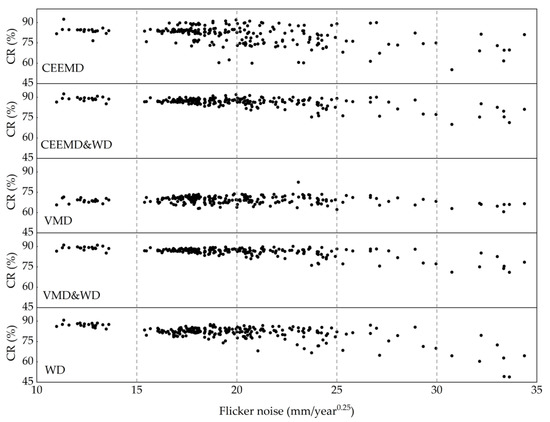 We calculated the CRs of several denoising methods for each GPS station to compare their ability to denoise (Figure 6). In general, the averages of CRs for 226 GPS stations, after utilizing five denoising approaches, are 80.93% for CEEMD, 86.47% for CEEMD & WD, 69.39% for VMD, 86.27% for VMD & WD, and 81.49% for WD, respectively. In order to compare the denoising ability of different methods, this study further categorized the 226 GPS coordinate time series with different noise levels into five groups. This is based on research concerning the influence of flicker noise with 1 mm/year0.25,10 mm/year0.25, and 25 mm/year0.25 on the extraction of seasonal signals from GPS coordinate time series [36] and the number of employed stations with varying flicker noise. The five groups are designated as follows: 10–15 mm/year0.25 comprises 19 stations,15–20 mm/year0.25 comprises 111 stations,20–25 mm/year0.25 comprises 75 stations,25–30 mm/year0.25 comprises 13 stations, and 30–35 mm/year0.25 comprises 8 stations.