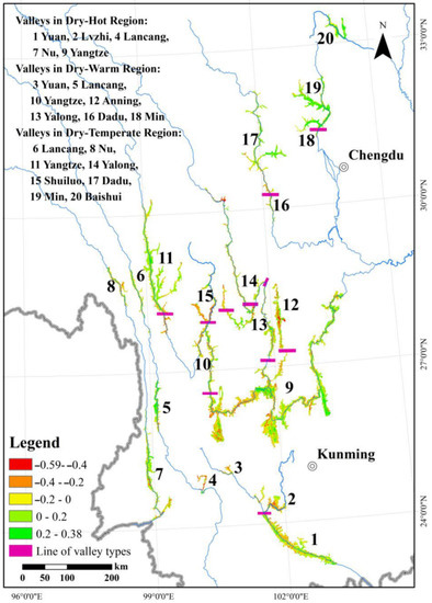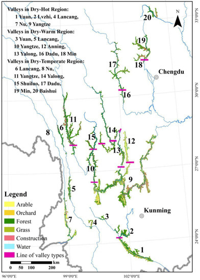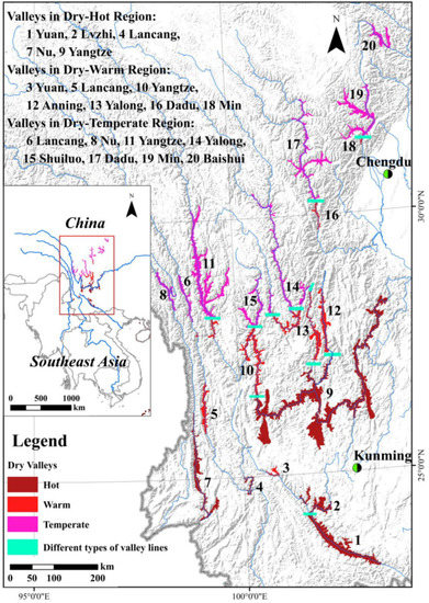 - Fan, J.R.; Yang, C.; Bao, W.K.; Liu, J.L.; Li, X. Distribution scope and district statistical analysis of dry valleys in Southwest China. Mt. Res. 2020, 38, 303–313, (In Chinese with English Abstract). [Google Scholar] [CrossRef]