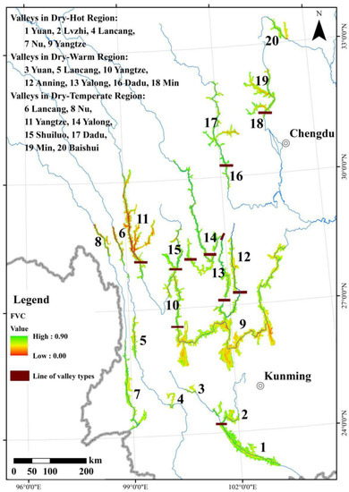 The long-term average annual FVC of 20 dry valleys in Southwest China.