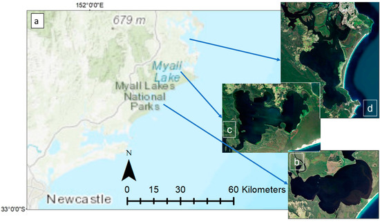 (a) Bombah Broadwater, Myall Lake, and Wallis Lake along the coast of New South Wales, north of Newcastle (Australia). (b) Bombah Broadwater. (c) Myall Lake. (d) Wallis Lake.