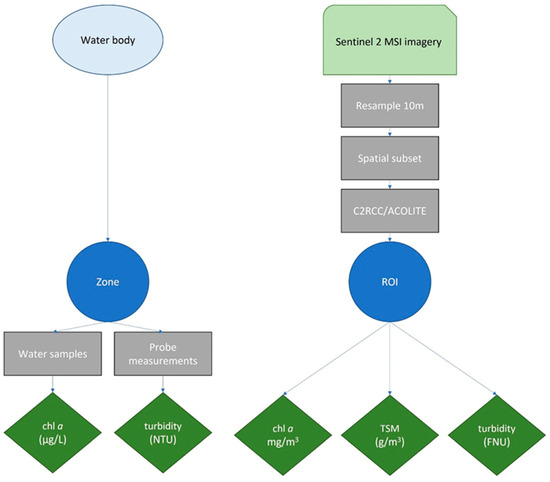Workflow of in situ data collection and analysis and satellite imagery processing. In situ measurements, chlorophyll a concentration is measured in µg/L and turbidity in NTU. Image processing estimated chlorophyll a concentration is measured (mg/m3), total suspended matter in (g/m3), and turbidity in FNU (ROI means ‘region of interest,’ the drawn polygons).