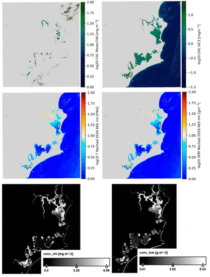 Processed outputs of RS products, from Sentinel-2MSI imagery captured on 22 March 2019. In the top row from left to right are the outputs by the Moses and oceancolor 3, middle row Nechad FNU (turbidity index) and Nechad 2016 suspended matter (spm), in the bottom row C2RCC products chlorophyll a concentration and total suspended matter (tsm).