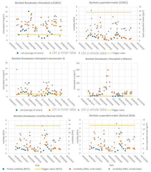 The MER Program has set ‘trigger values’ as an important factor in determining water quality grades. Different trigger values are set for lakes and river estuaries. For lakes (used in this study), these trigger values are 2.5 µg/L for chlorophyll a and 6.7 NTU for turbidity [18]. Estuaries have a natural variation in chlorophyll a levels and turbidity. Above the trigger value, a variable is out of the ‘normal range’ and may call for further investigation.
