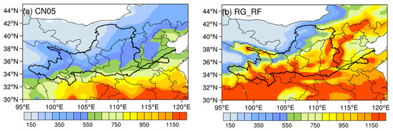 The spatial distribution of precipitation simulated by the RegCM4 (Experiment RG_RF) is consistent with the observations from the CN05 dataset, but it has a wet bias, particularly in mountainous regions. As shown in Figure 2a, precipitation in the YRB displays a distinct geographical pattern with decreasing spatial pattern from south to north. The observed precipitation is primarily concentrated in the southern part of the YRB, with an average of less than 550 mm in most areas, while the observed multi-year average precipitation in the south is between 600 mm and 800 mm. The spatial correlation between the simulated precipitation and the observations in China is 0.56, and the observed multi-year average precipitation intensity is 1.69 mm/day (as shown in Table 3). In the YRB, the spatial correlation between the simulated precipitation and the observations is 0.83. However, the simulated multi-year average precipitation intensity of 3.05 mm/day is almost double that of the observed value.