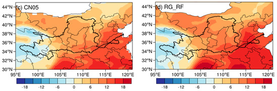 The performance of RegCM4 for air temperature in the region is better than for precipitation. The spatial distribution of temperature simulated by RegCM4 is almost consistent with observation, with a 2–3 °C warm bias overall (Figure 2c,d). The observed multi-year average air temperature in China is 6.42 °C and has a spatial correlation coefficient of 0.97 between observed and simulated air temperature (Table 3). In the YRB, the observed multi-year average temperature is around 5.69 °C, and the simulated air temperature has a spatial correlation of 0.99 with observation. Overall, although there are biases in precipitation and temperature, RegCM4 still has good performance in simulating the climatology of the YRB. The model can accurately capture the main spatiotemporal patterns of the observed precipitation and air temperature.